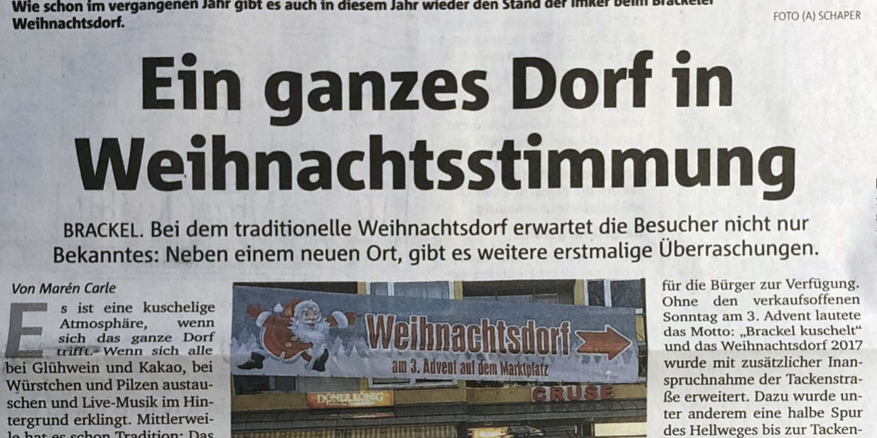 Dez.142018BrackelPresseVeranstaltungen & Aktionen Brackel. Bei dem traditionellen Weihnachtsdorf erwartet die Besucher nicht nur Bekanntes: Neben einem neuen Ort, gibt es weitere erstmalige Überraschungen… Erschienen in den Ruhr-Nachrichten im Dezember 2018 Teilen Sie diesen Post Share on FacebookShare on Facebook TweetShare on Twitter Share on WhatsAppShare on WhatsApp Kommentarnavigation